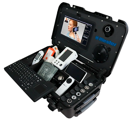 La maleta de Telemedicina Global está diseñada para permitir evaluaciones de pacientes en ubicaciones remotas seleccionadas a nivel mundial. Los datos pueden capturarse y transferirse desde varios dispositivos médicos para permitir al proveedor de atención médica tratar al paciente en el lugar.